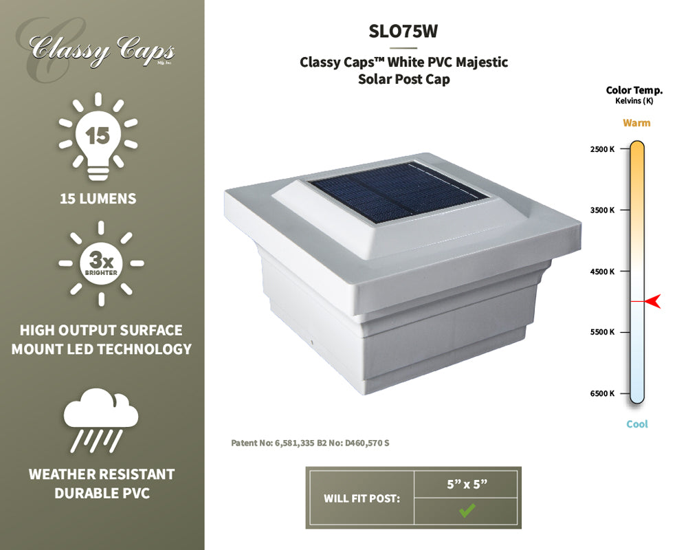 5"x5" solar light made from PVC and includes 4 surface mount LEDs. Designed to cascade light down the outside walls of the cap and surrounding area.